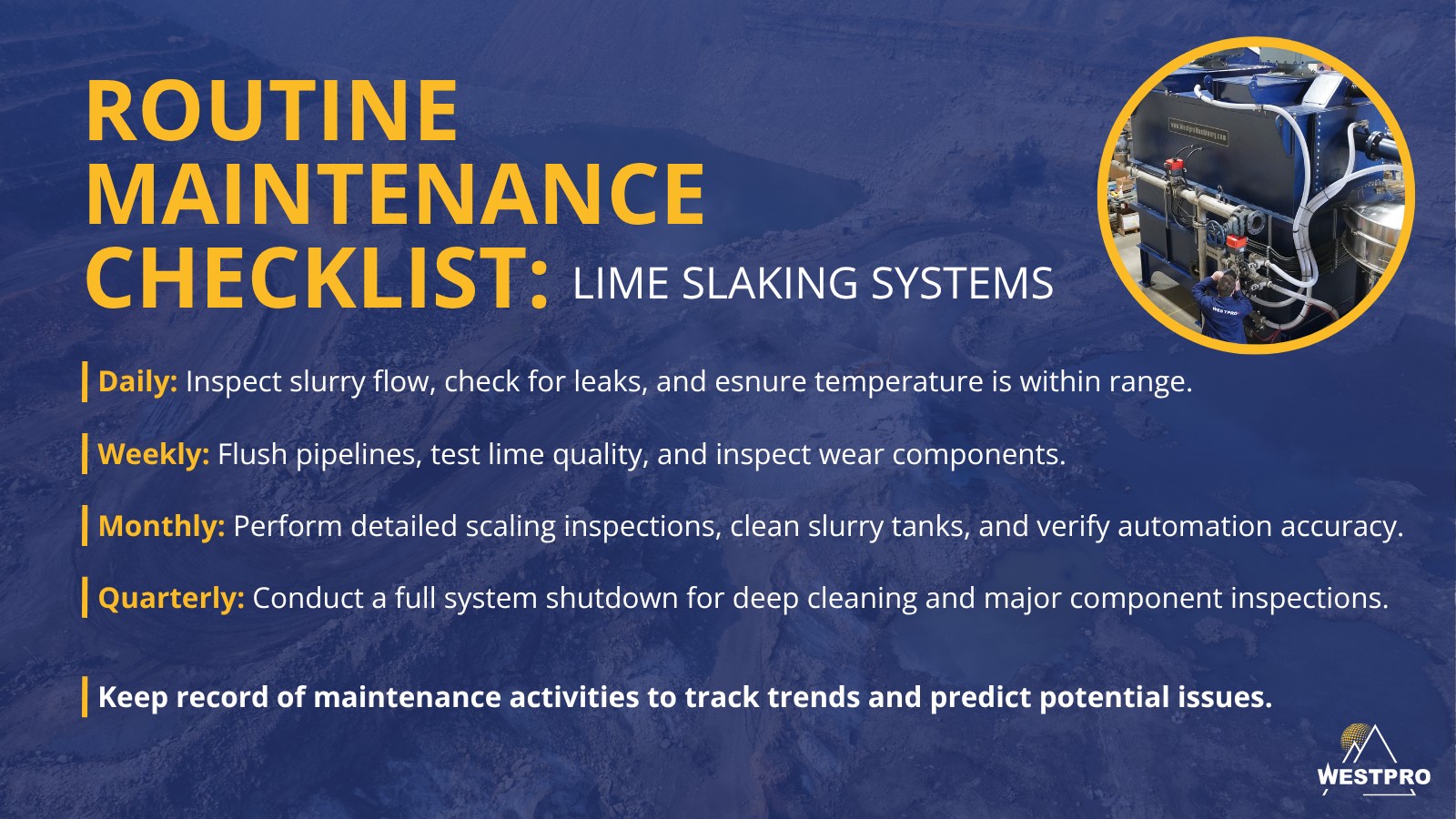 Even the best lime slaking systems require routine maintenance to avoid costly downtime. Stick to this checklist to keep your operation in peak condition: